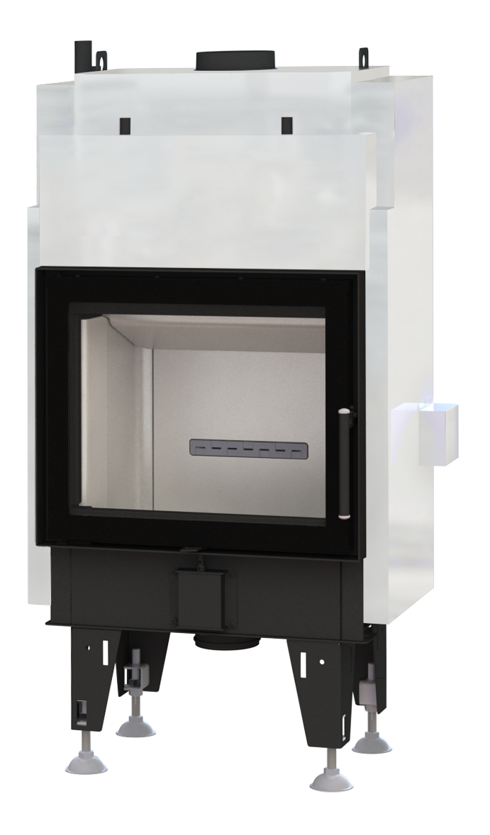 Der Körper des Kamineinsatzes ist mit der Isolation bedeckt. Der Kamineinsatz hat die Dreifachverglasung im Standard. Auch dank dessen wird maximaler Wirkungsgrad in die Wassertasche übertragen.