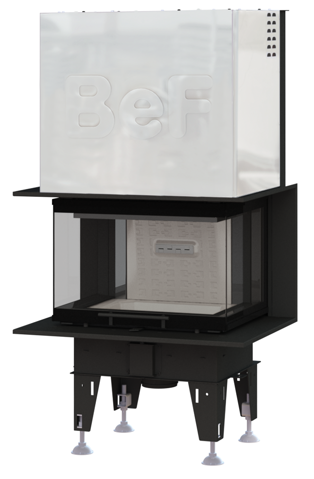 Panoramakamin mit dreiseitiger Verglasung und hochschiebbarer Tür. Ein schwarzer Blendrahmen ist bereits werksseitig integriert und ermöglicht einen sauberen Abschluss zwischen Mauerwerk und Kamineinsatz.